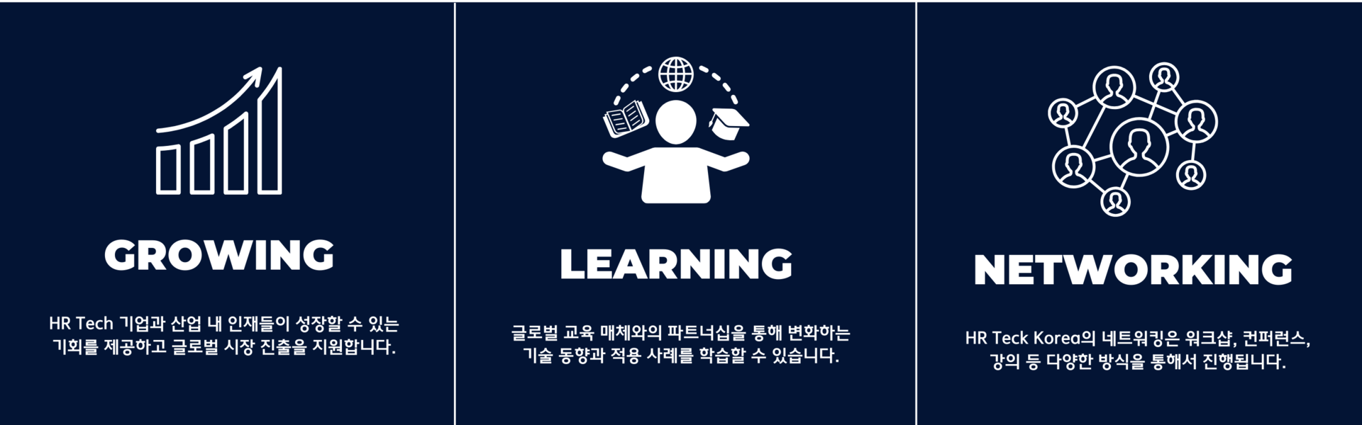 HR Tech Korea가 향후 진행할 모든 활동도 이러한 3가지의 기둥(Pillar)을 바탕으로 세워져 갈 것입니다.